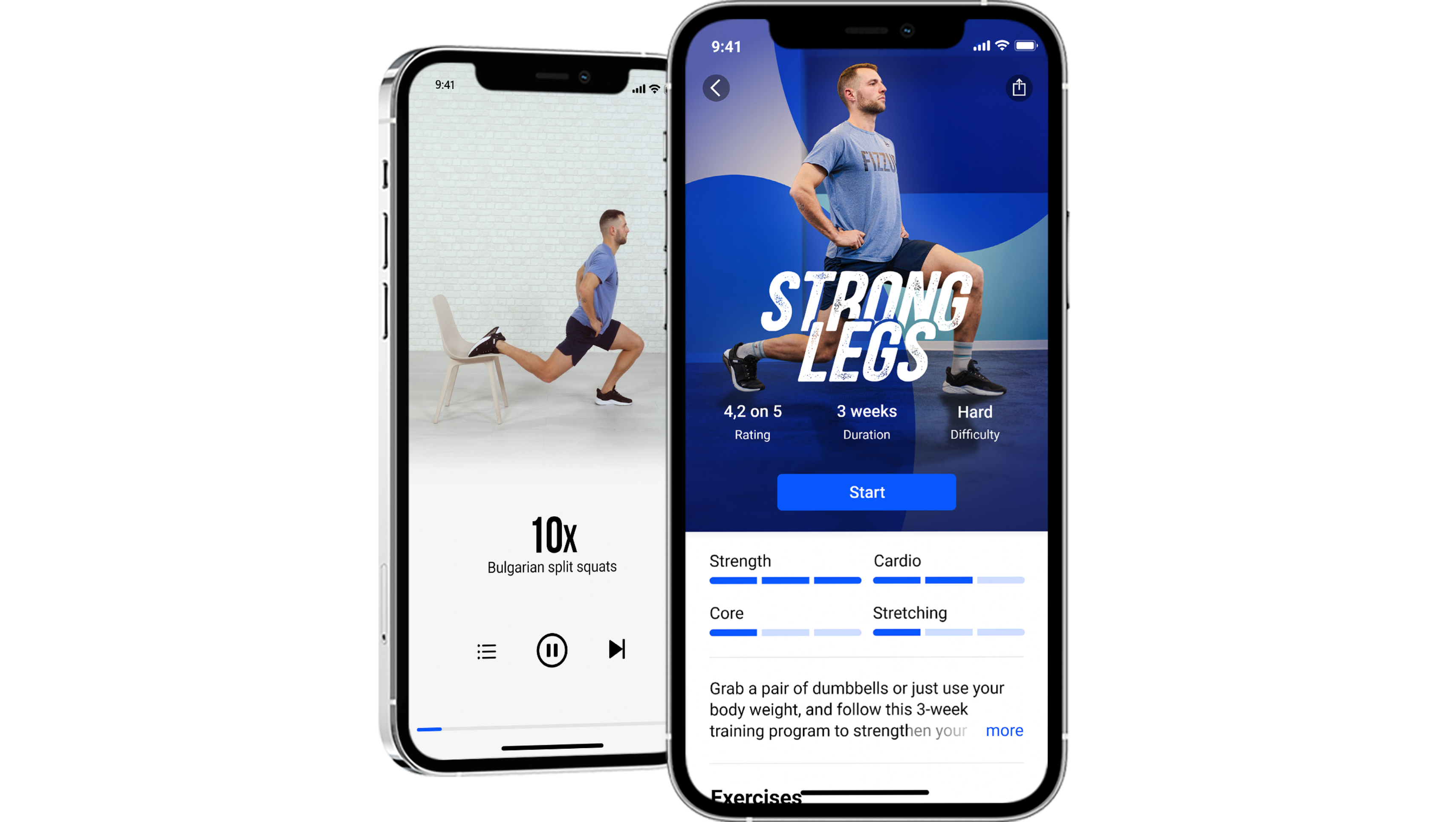 FizzUp offers a strength-training plan you can adjust to your level and goals. Strong Legs targets your leg muscles with focused lower-body exercises like Bulgarian split squats, side lunges, glute bridges, and air squats.
