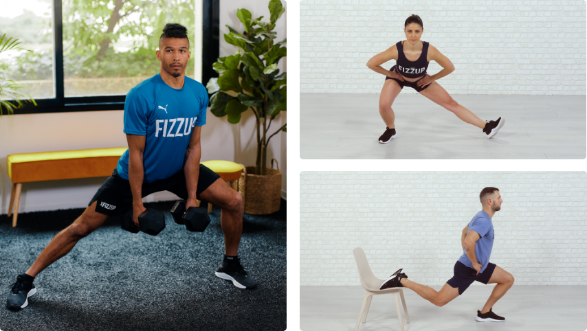 Reps and session lengths are adjusted based on that initial assessment, so there’s no pressure—progress will be visible no matter what. Core exercises like Bulgarian split squats, regular squats, side lunges, and glute bridges—all doable with or without dumbbells—form the foundation of the program. Some moves may be more challenging than others, but FizzUp guides you through them.
