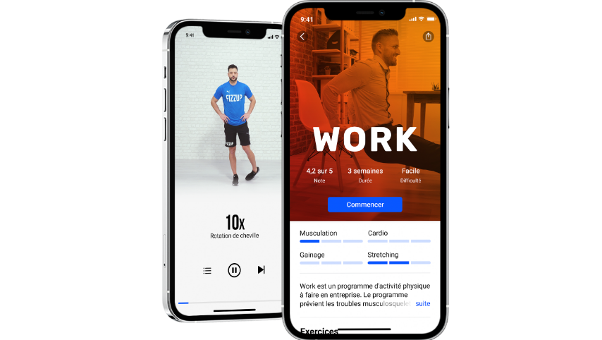 FizzUp propose des centaines de programmes qui répondent tous à un besoin précis. Le programme Work a pour but de vous faire bouger régulièrement pendant votre journée de travail. FizzUp transforme ainsi vos journées grâce à de rapides moments actifs. Et cela est un vrai “game-changer” pour votre santé.